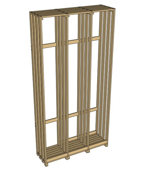 - Lagerregal mit drei Abteilen für Ski und Snowboard.
